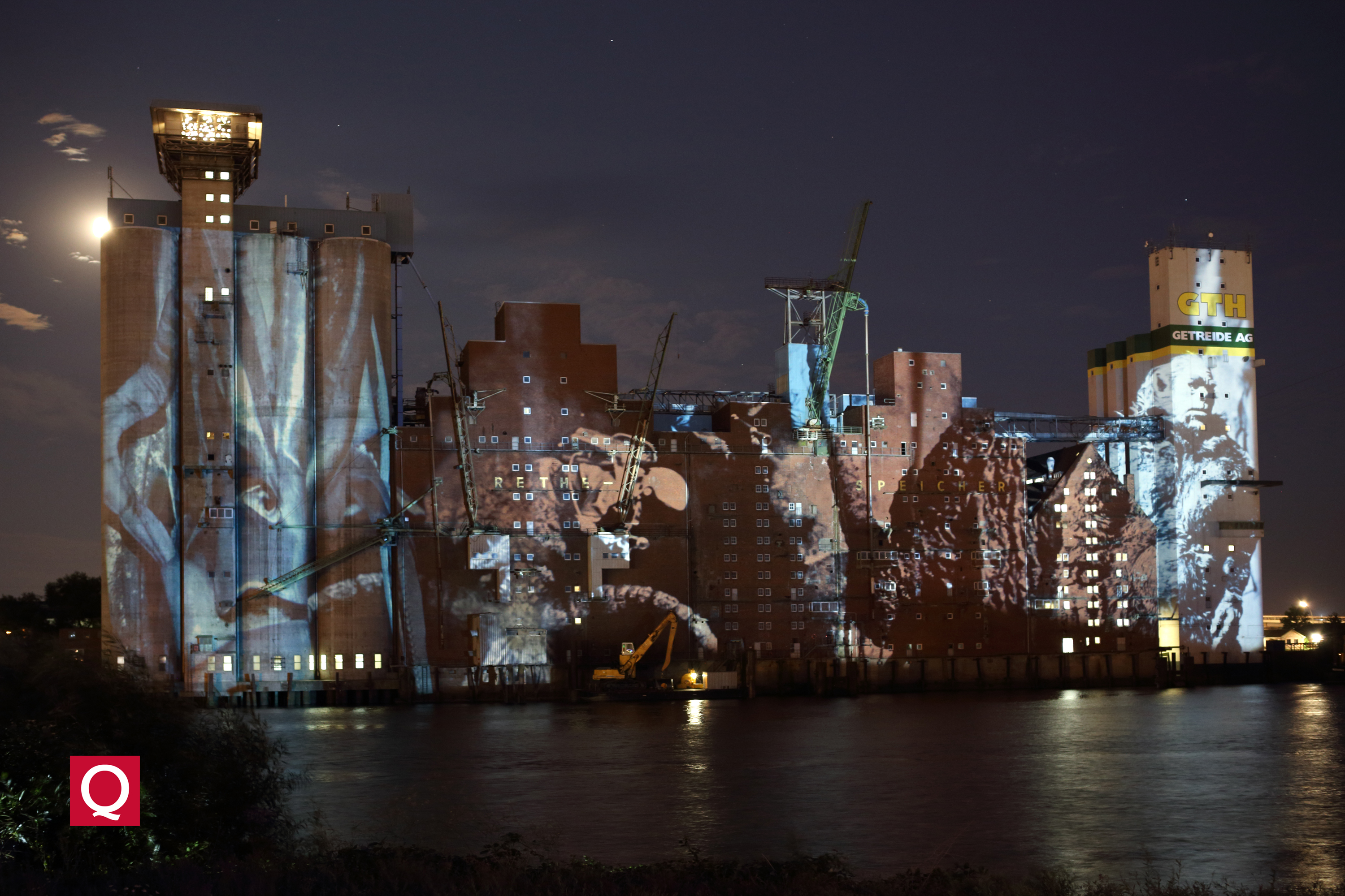 Rethespeicher-Illumination von Nico de Rooij, Djana Covic und Tim Vermeulen. Es ist dieser Speicher umgeben von Wasser, der das besondere Flair der Dockville Location ausmacht.